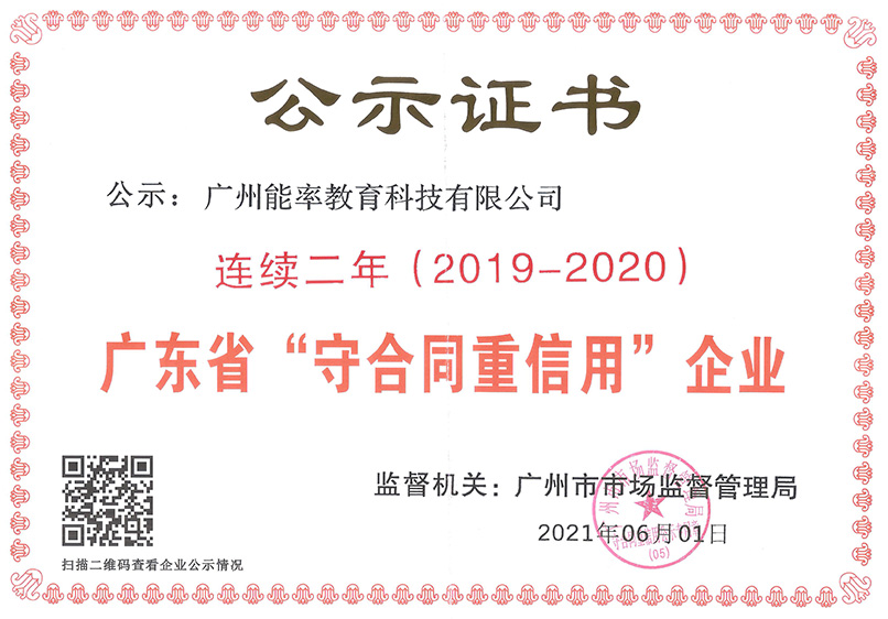 6月,必克英语再次获评广东省“守合同重信用企业”