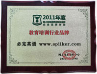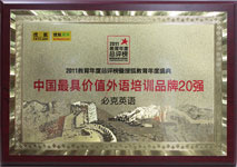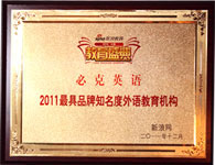 在第四届新浪2011中国教育盛典上,必克英语荣获2011年度更具品牌知名度外语教育机构大奖。