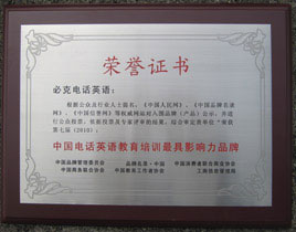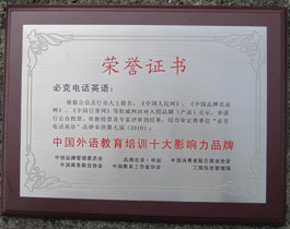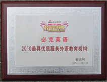 中国品牌管理委员会授予必克英语“2010年中国在线英语教育培训更具影响力品牌”,“2010年中国外语教育培训十大影响力品牌”荣誉称号