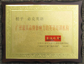 广东珠江广播“教育访谈”、中国青年教育在线、广州青年教育频道、《生活向导》杂志社联合授予必克英语“广州更具品牌影响力的英语培训机构”荣誉称号