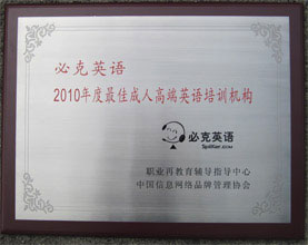 中国信息网络品牌管理协会、职业再教育辅导指导中心共同授予必克英语“2010年度最佳成人高端英语培训机构”称号