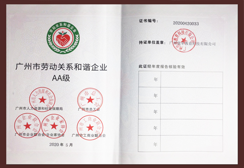 5月,经广州市企业联合会/企业家协会、广州市工商业联合会考核认定,必克英语荣获“劳动关系和谐企业AA级”殊荣