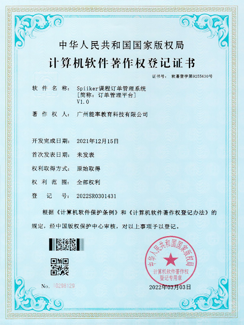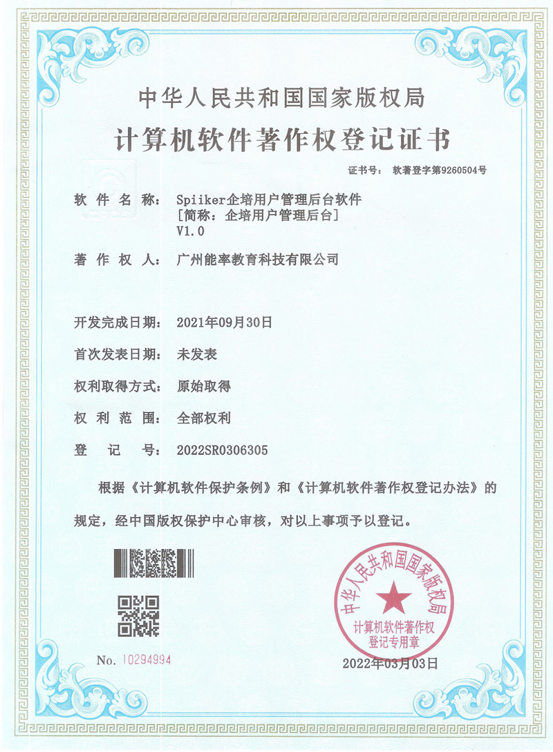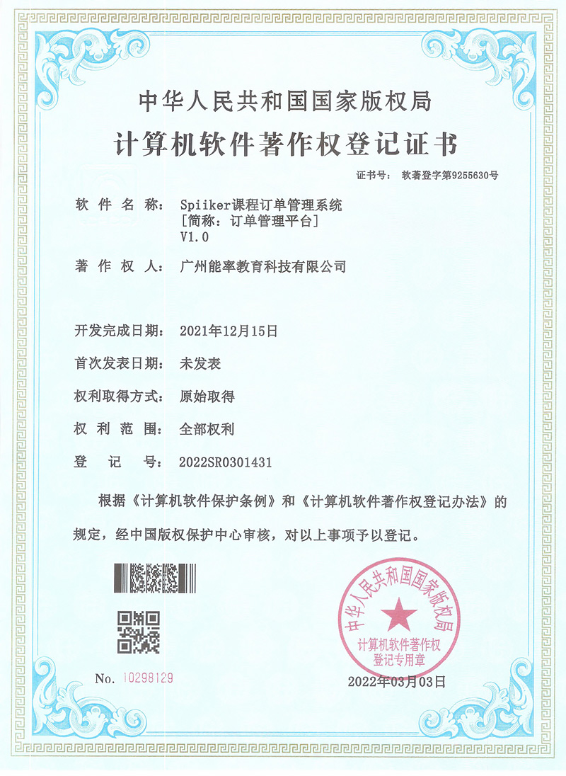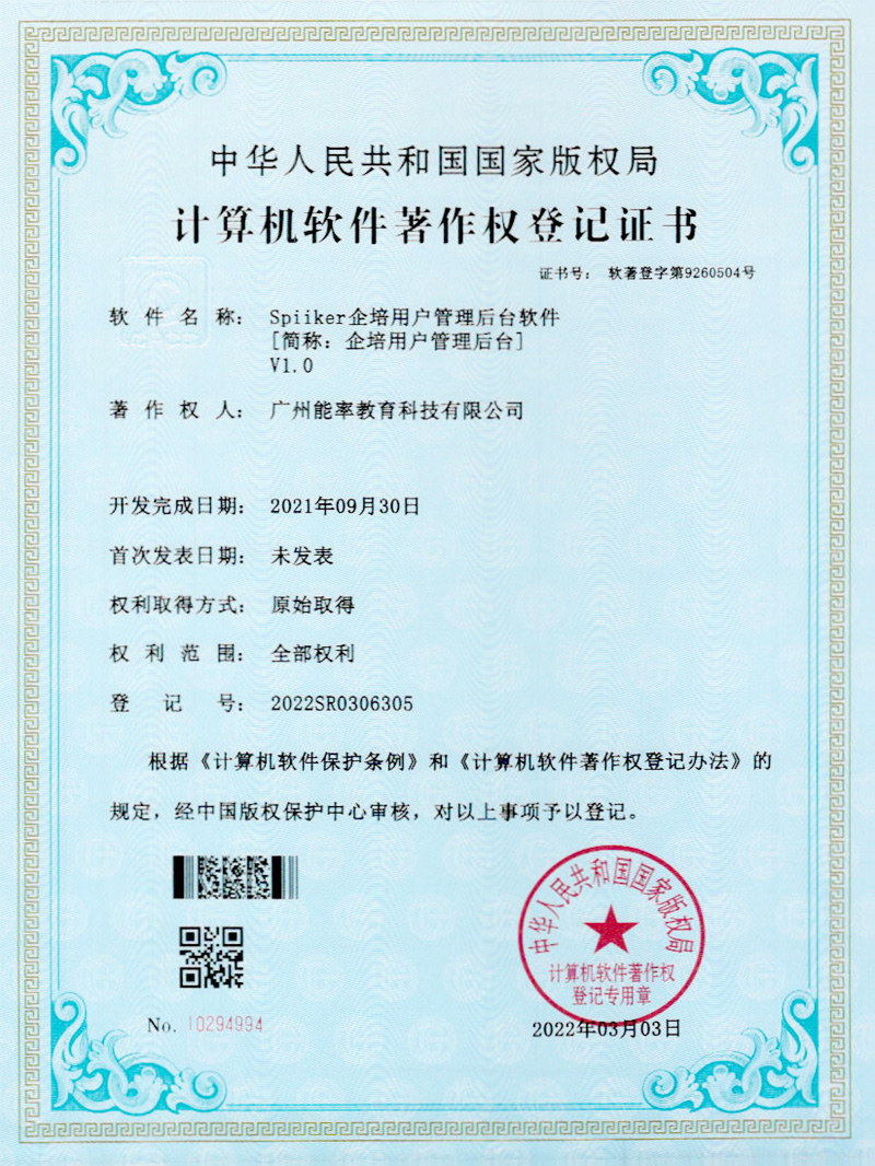 2022年3月,必克英语再次获得“国家版权局计算机软件著作权登记证书”