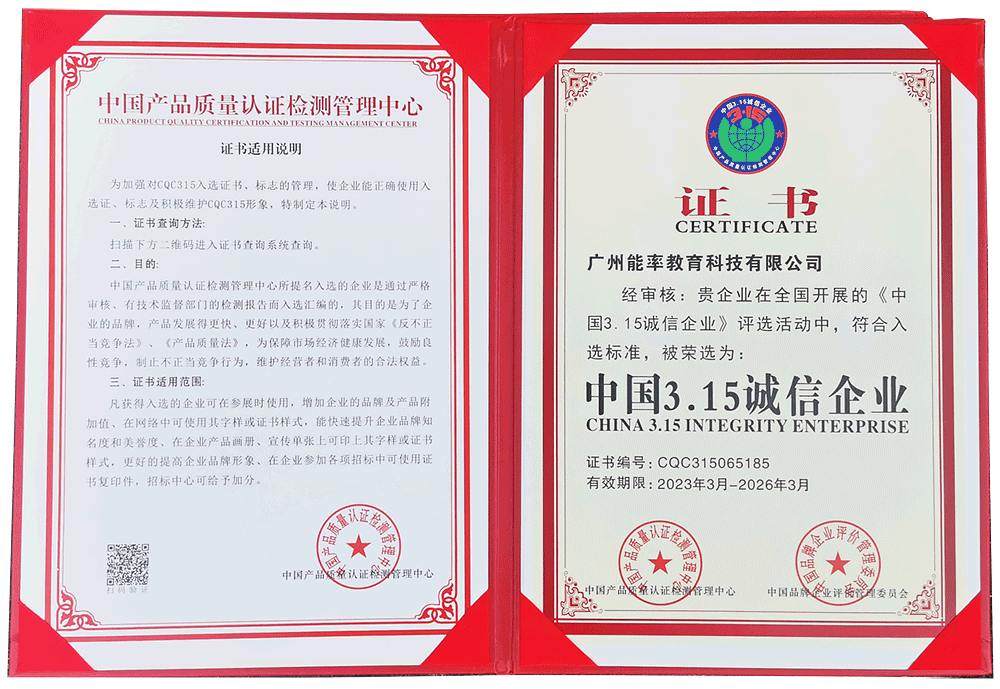 2023年3月,必克英语获评中国产品质量认证检测管理中心“中国3.15诚信企业”