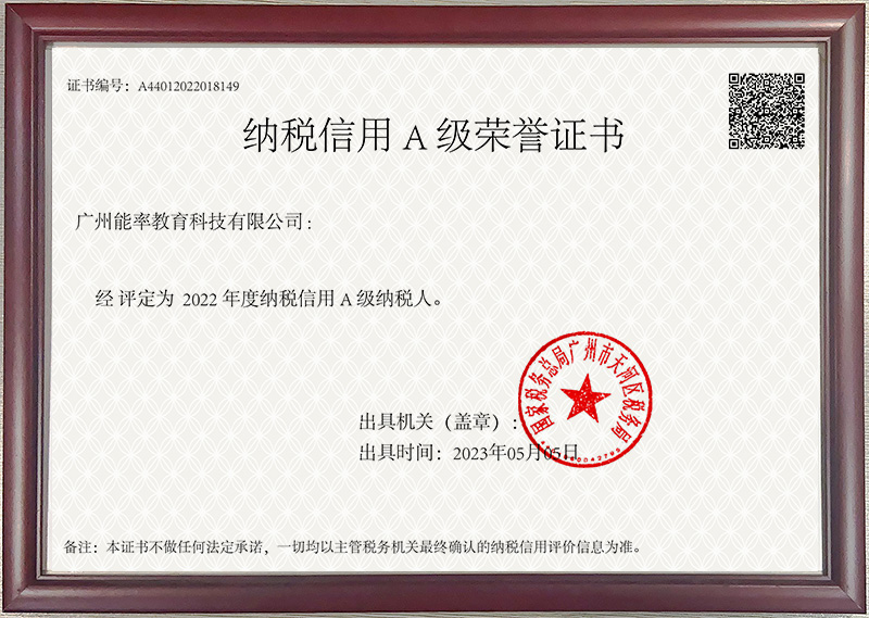 2023年5月,必克英语获得广州市纳税信用A级荣誉证书